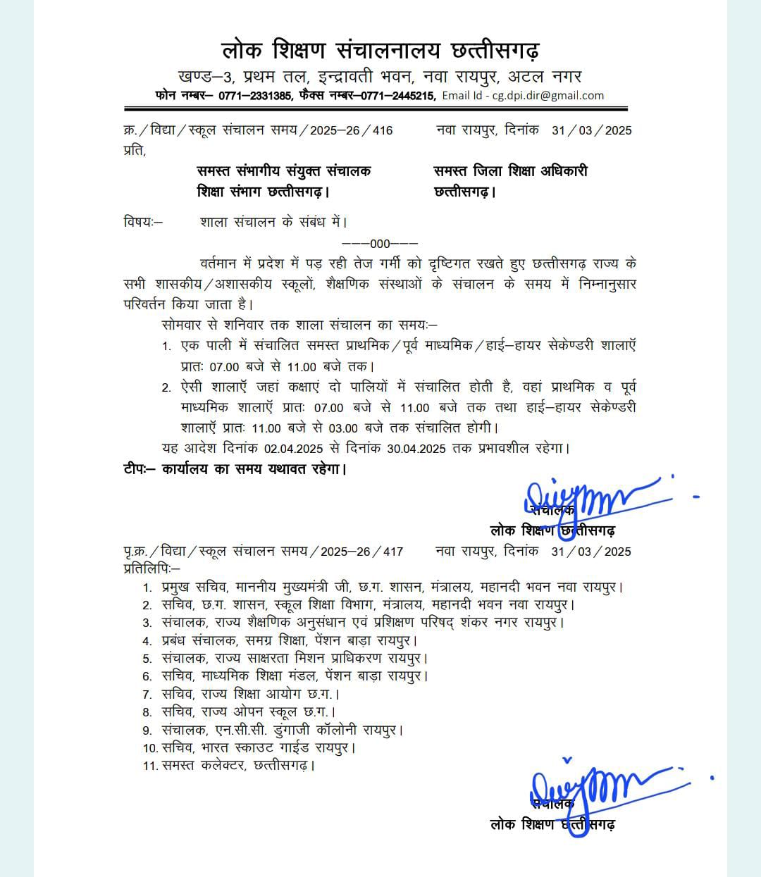 यह एक सरकारी आदेश है जो छत्तीसगढ़ राज्य के सभी शासकीय और अशासकीय स्कूलों के संचालन समय में परिवर्तन के बारे में है। यह आदेश विशेष रूप से राज्य में तेज गर्मी के कारण शैक्षणिक संस्थाओं के संचालन समय को समायोजित करने के लिए जारी किया गया है।
